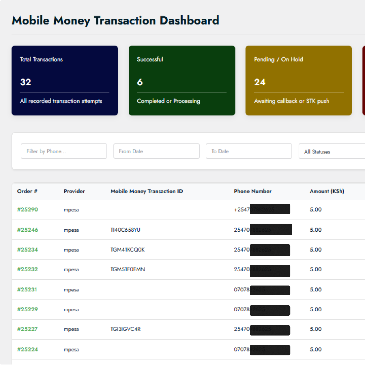 - Transaction IDs logged automatically — every M-Pesa reference code captured against the order